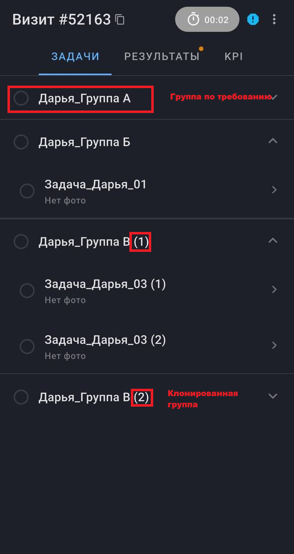 Помимо этого, сотрудники могут добавлять задачу/группу задач в мобильном приложении, если руководитель уже создал их на портале и включил настройки "по требованию" и "разрешить клонирование". Сделать это можно в открытом визите, в его настройках через "+".