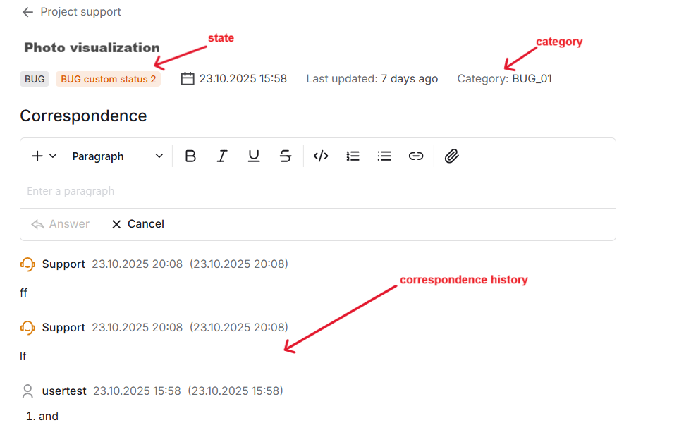 • You only see your own tickets; tickets from other users are not available. • Conversations only display comments, without any service information (such as who viewed the ticket). • You do not receive notifications about your own messages, only about support activity.