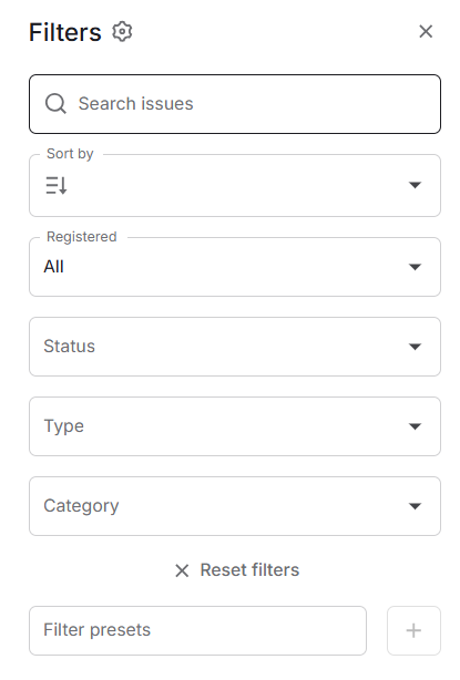 • Search by ticket subject • Sorting (by registration date, update date) • Ticket type: BUG or CR (only the ticket types you have permission to create are displayed) • Status • Category (if applicable).