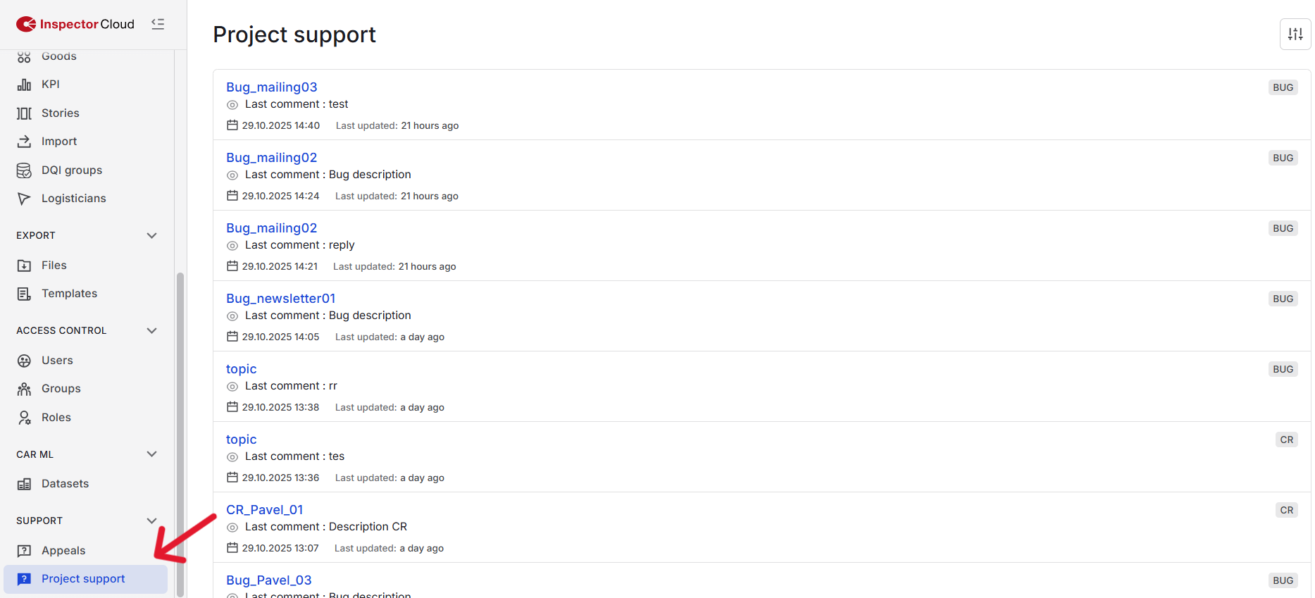 The "Project Support" section is only available to users with permission to create CR (Change Request) or BUG tickets.