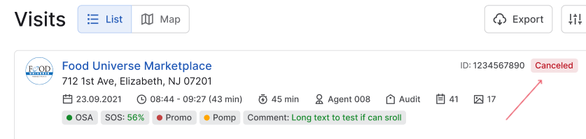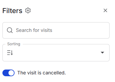 A cancelled visit in the general list of visits has a “Cancelled” label highlighted in red.
