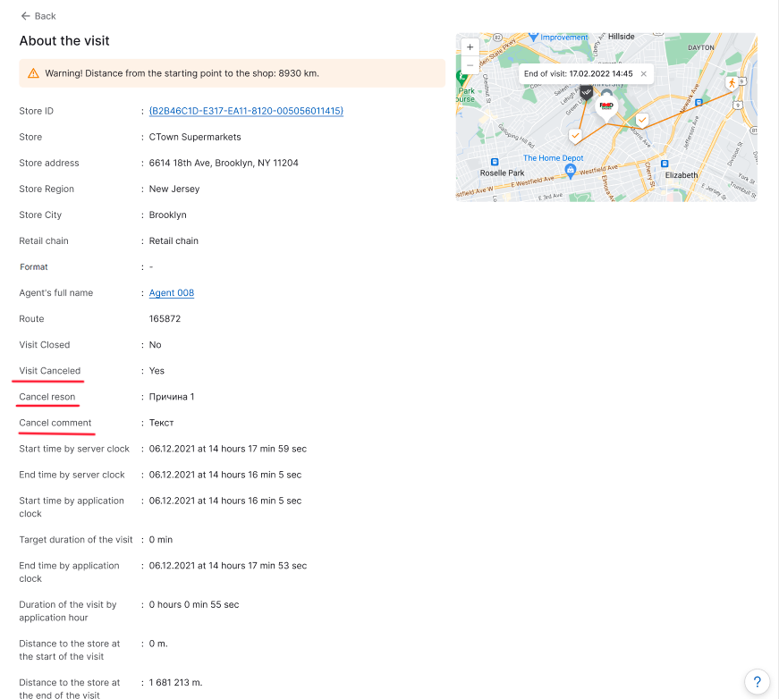 After a user cancels a visit in the mobile app, information about such visits can be viewed in the "Visits" section of the portal.